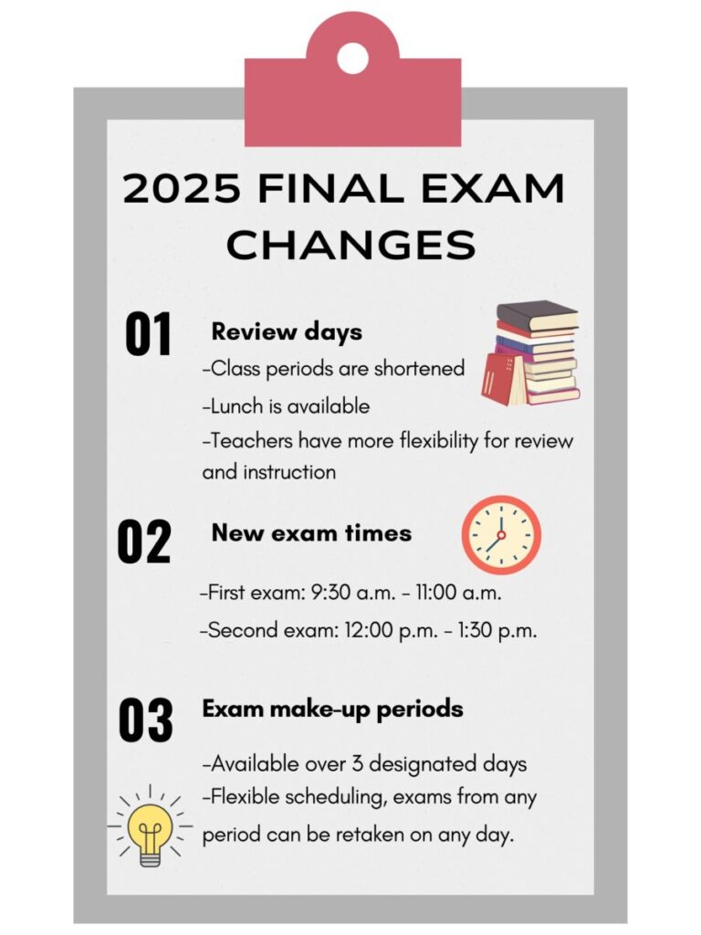 The NCHS administration has implemented several changes to the June 2025 final exam schedule, based on feedback from faculty, students, and parents that arose after January’s midterms. The most notable adjustments involve introducing more flexible instructional time as well as promoting student wellness, according to Principal William Egan.