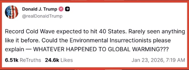 But the reality is, what happens in parts of the US over six weeks isn’t what’s happening across Planet Earth. And the fact that it’s cold where we are doesn’t mean that temperatures aren’t extremely high elsewhere. On January 27, 2026, just two days after our massive winter storm, Hopetoun and Walpeup in Victoria state, Australia, set records with temperatures as high as 120 degrees. It’s important to remember that the world is much bigger than just the United States, and just because we are experiencing a cold stretch doesn’t mean that the issue of climate change has just disappeared.