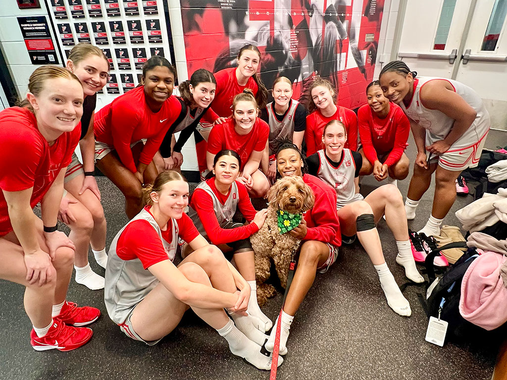 Beyond orientation, therapy dogs are also being used to support students facing ongoing pressures throughout the school year. Scarlett, for example, visits Sacred Heart University weekly, with many trips focused specifically for the student athletes. “The Division I athletes, especially freshmen, have a really hard time with the demands of their sport and academics,” Ms. Moody said. “It’s really, really hard because they have to devote 20 hours a week to their sport, not including game time. That’s five days a week, four hours a day lifting, watching film, and practicing, plus games, homework, and six hours a week in study hall. One way to get them to go is to have a dog there.”
