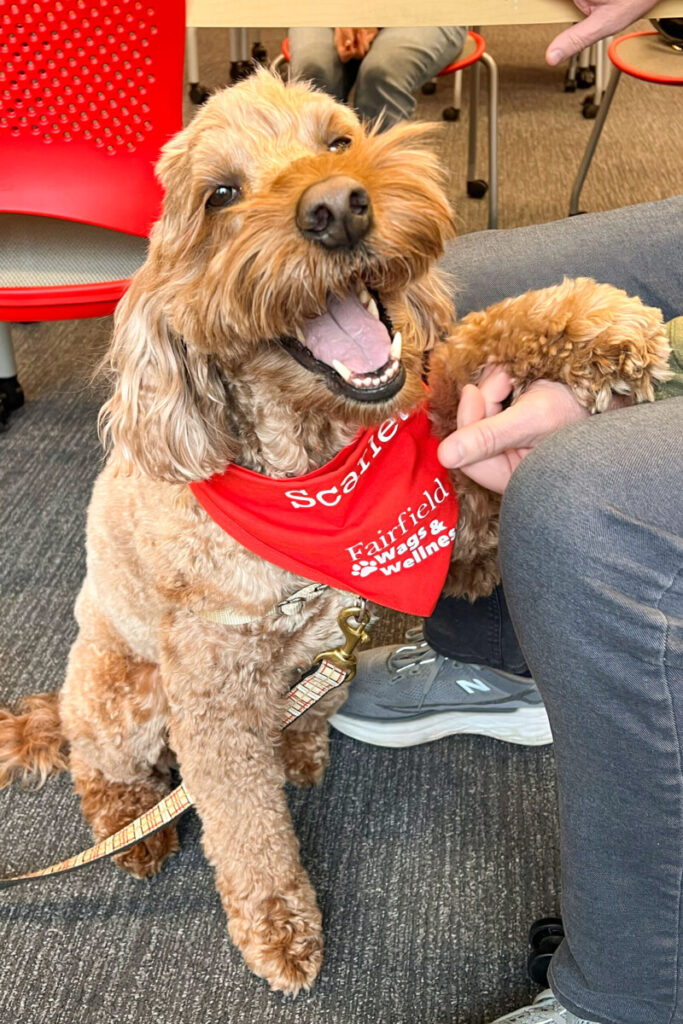 These frequent visits have allowed students to build relationships with Scarlett. “She’s there so much that students know her,” said Ms. Moody. “They know when to come see her. But it’s always the same reaction—they collapse on the floor, pet her, take pictures of her, FaceTime their parents, post on TikTok or Instagram.” Many of them, having their own dogs, get a little taste of home every time Scarlett stops by.
